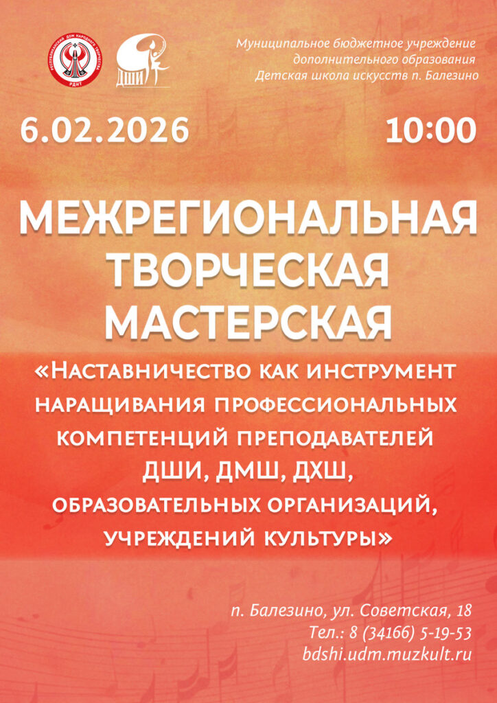 Заявки принимаются до 22 декабря 2025 года (включительно) по электронной почте: dshi_balezino@mail.ru с указанием темы письма: «Мастерская 2026».